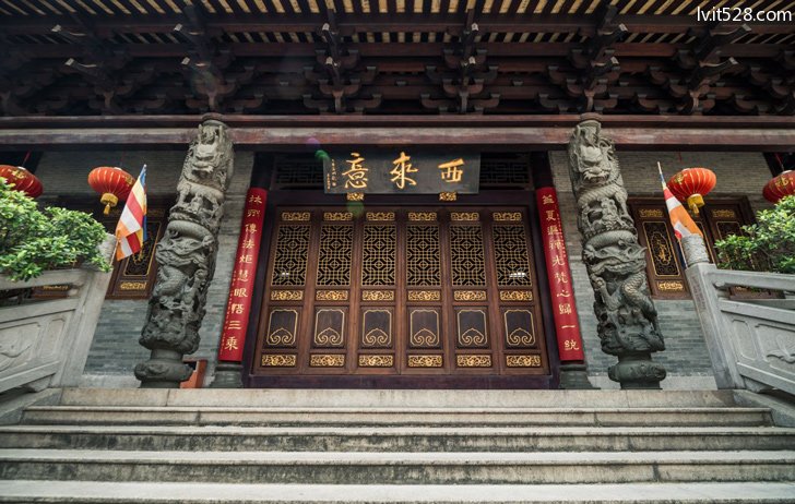 今天的华林寺虽地处繁华市区,但却闹中取静。寺坐西朝东,山门两侧各放两只石狮子和两只石鼓。山门石额上铭刻着“华林禅寺”四个字,两侧石柱刻有一副对联:“华严世界观十万诸佛,林茏鹫山隐五百应真。”进了山门,两端是星岩石塔,南面为一列平房,内有一间功德堂。功德堂的旁边有初祖达摩堂,堂内供奉达摩盘膝全身像,1997年所建造的达摩堂落成后,达摩塑像随之移到那里。